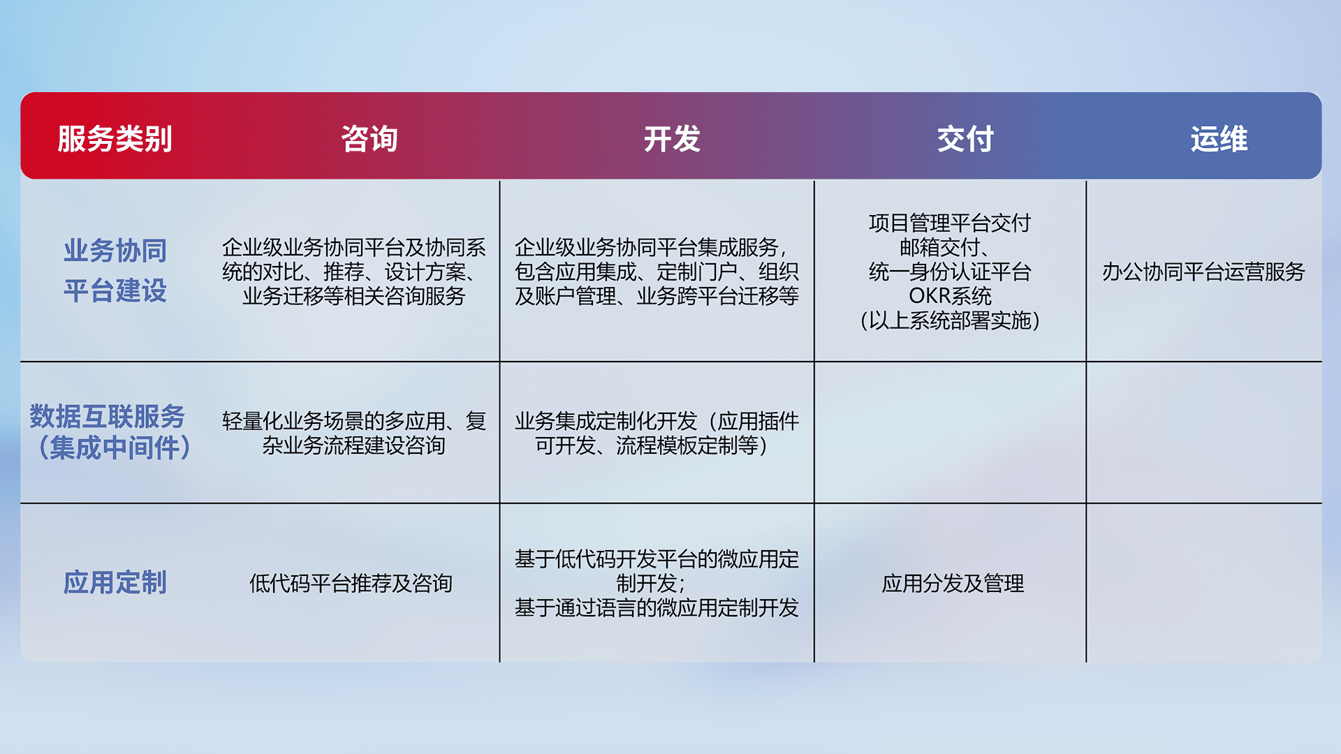 针对钉钉、、、、企微、、、、IDaas等平台级产品提供产品的规划、、方案、、交付、、、、定制化开发等服务,,实现如统一协同办公、、智能客户服务、、、混合会议管理、、、、智能数据查询、、、等业务场景,,,,实现数字化转型。。。。