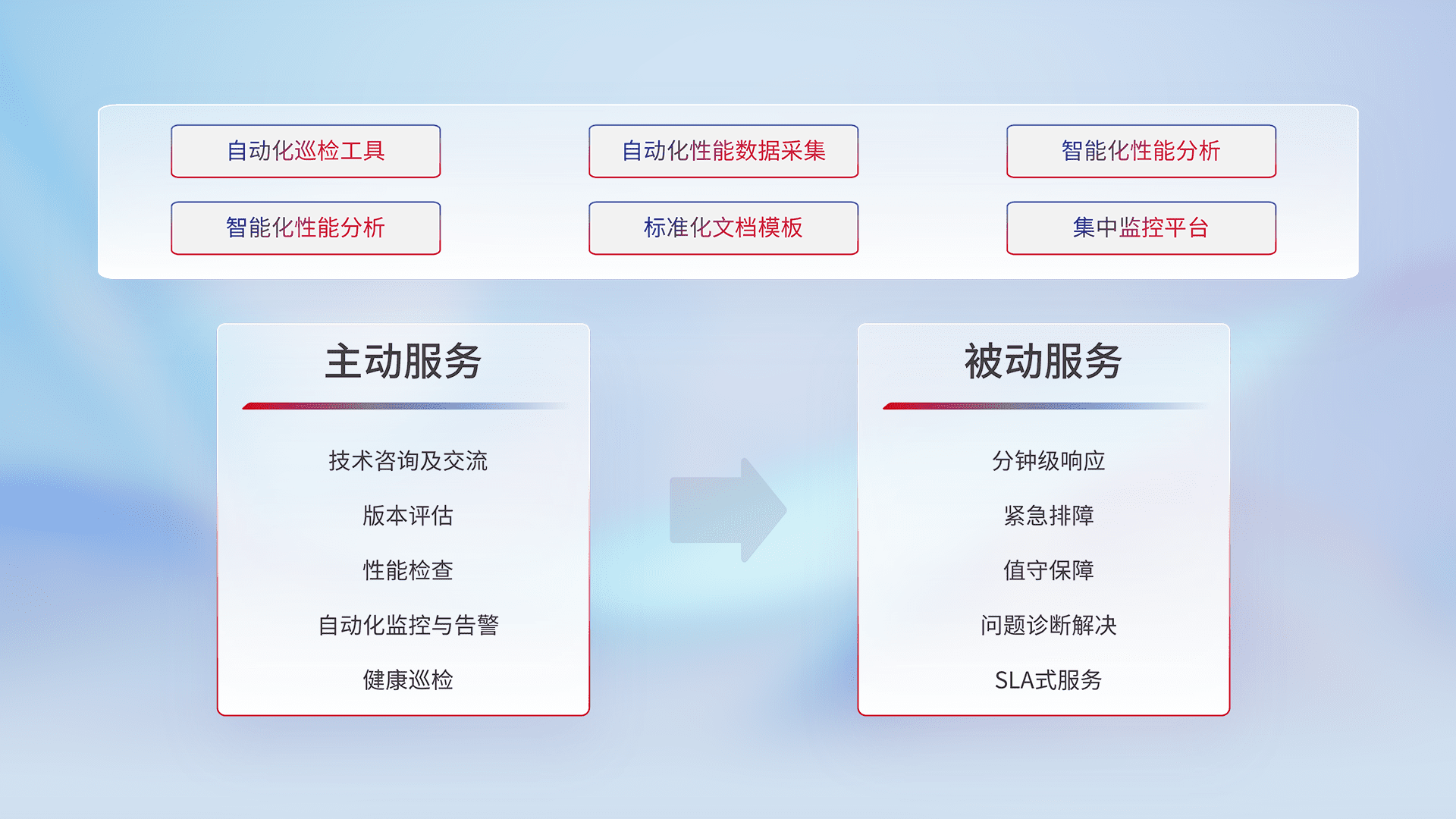 智能化工具和标准化文档,,保障服务质量,,,提供主动服务(包含技术咨询、、版本评估、、、、性能检查、、、自动化监控与告警、、、健康巡检)和被动服务包含(分钟级响应、、、紧急排障、、、值守保障、、、、问题诊断解决、、、、SLA服务)。。。。