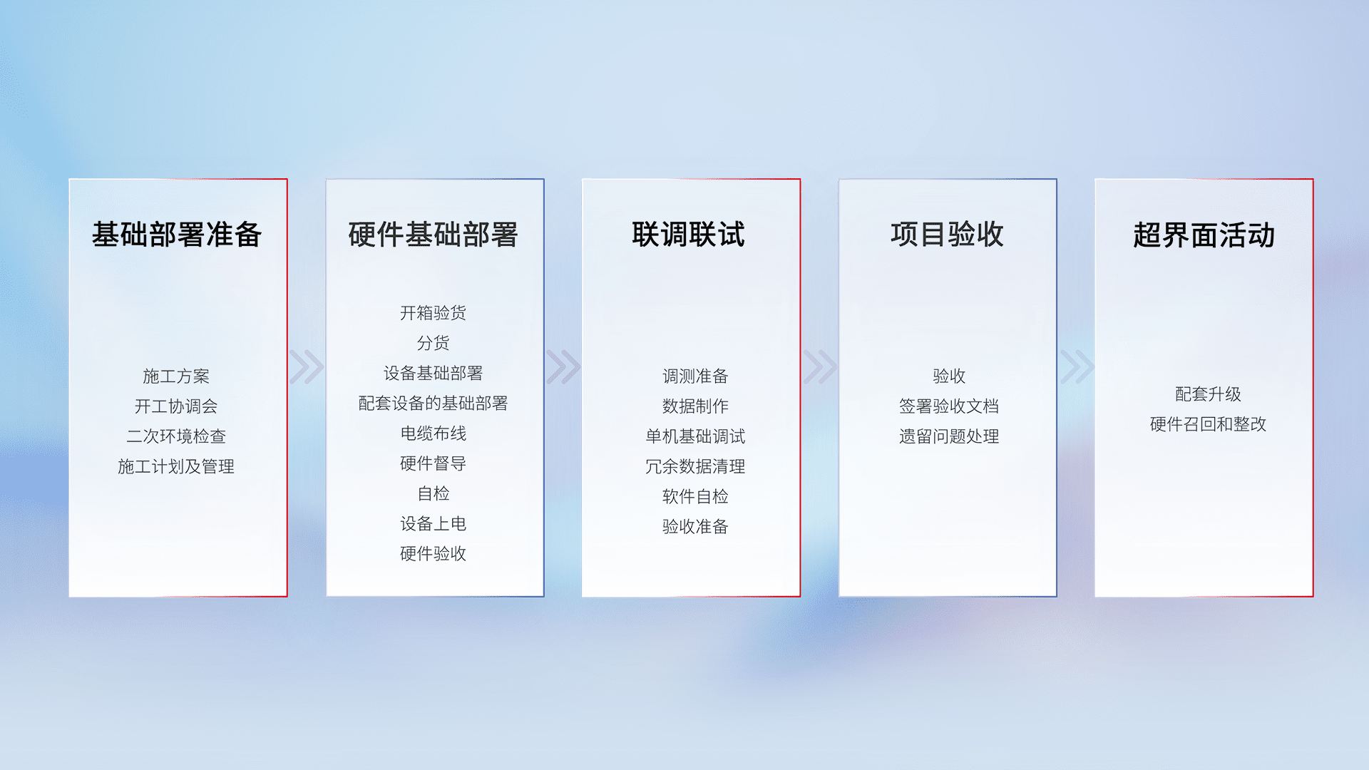 从基础部署准备、、硬件基础部署、、联调联试、、、项目验收、、越界面活动的全过程可追溯,,,保证施工质量和进度。。。。